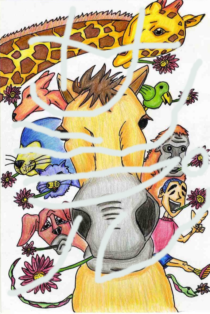 ★人間と動物が楽しくふれあっている様子を描いた作品です。「元気」と「笑顔」をテーマに描きました!!